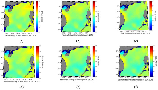 Salinity reconstruction results of the 50 m water depth for June 2016–2018. (a) True salinity of 2016; (b) True salinity of 2017; (c) True salinity of 2018; (d) Estimated salinity of 2016; (e) Estimated salinity of 2017; (f) Estimated salinity of 2018.