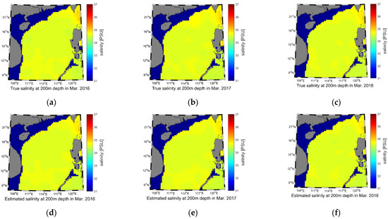 Salinity reconstruction results of the 200 m water depth for March 2016–2018. (a) True salinity of 2016; (b) True salinity of 2017; (c) True salinity of 2018; (d) Estimated salinity of 2016; (e) Estimated salinity of 2017; (f) Estimated salinity of 2018.