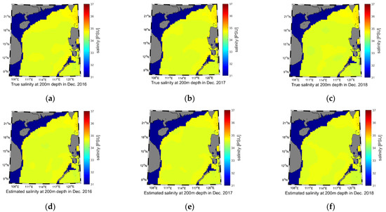 Salinity reconstruction results of the 200 m water depth for December 2016–2018. (a) True salinity of 2016; (b) True salinity of 2017; (c) True salinity of 2018; (d) Estimated salinity of 2016; (e) Estimated salinity of 2017; (f) Estimated salinity of 2018.