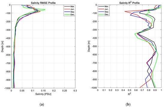 RMSE and R2 results of salinity for 2016–2018: (a) 3-year average RMSE for 4 months; (b) 3-year average R2 for 4 months. The RMSE and R2 count all grid points for each depth layer.