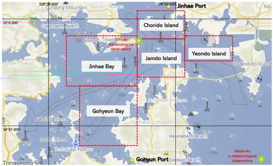 As depicted in Figure 1, the study area encompasses Jinhae Bay, Gohyeon Bay, and the surrounding waters near Yeondo Island, Jamdo Island, and Chorido Island, collectively known as Jinhae Bay.