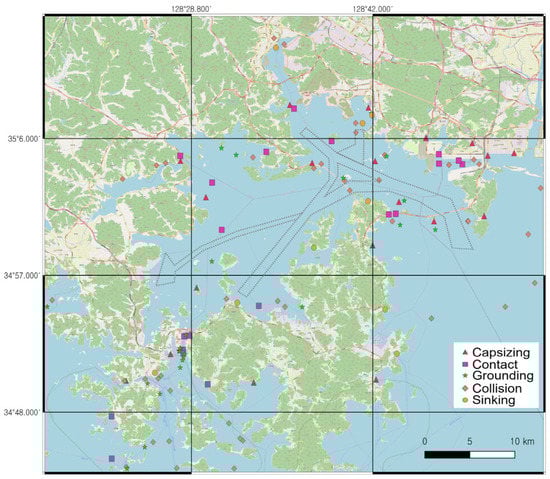 Figure 2 displays the occurrence of marine accidents (collision, grounding, contact, sinking, and capsizing) in the sea surrounding Jinhae Bay over the past two years (2019–2020). The Korea Maritime Safety Tribunal reported 185 marine accidents in the Jinhae Bay region during the same period. Although the locations of the accidents were generally dispersed, a concentration of accidents was observed near the entrance to Jinhae Bay, in the vicinity of Chorido Island and Geoga Bridge [32].