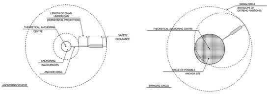 The PIANC (The World Association for Waterborne Transport Infrastructure) provides recommendations for the design of navigation channels to ensure safe and efficient passage of vessels in and out of ports and harbors. Equation (1) represents the minimum anchorage radius for the weather and seabed conditions recommended by the PIANC Harbor Approach Channels Design Guidelines, revised in 2014 [12].