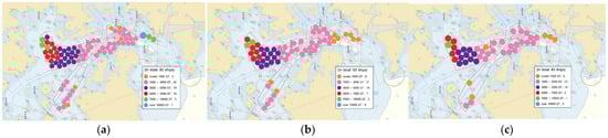 The last typhoon-seeking vessel’s arrival date was analyzed using Automatic Identification System (AIS) track information to evaluate the maritime traffic situation of ships seeking shelter at Jinhae Bay. The data are presented in Table 3. The AIS traffic information at the time of arrival of the final typhoon-seeking ship for each typhoon was analyzed. The analysis was based on 24 h track data, starting at 09:00 on the day of the typhoon’s impact and ending at 09:00 the following day.
