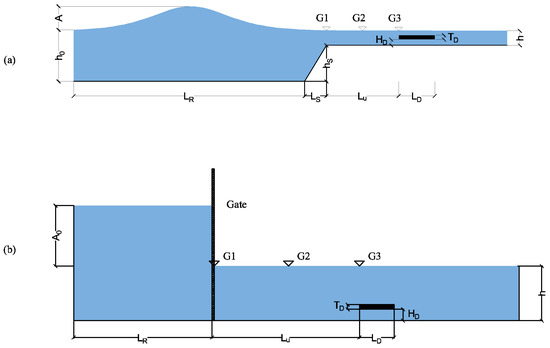 As the initial shape and form of the solitary wave and the dam-break are different, a reasonable way to compare these two breaking mechanisms is introduced in this section. Figure 1a shows a schematic of the numerical tank where the solitary-wave-breaking bore is studied. The solitary wave breaks when the downwave water depth decreases sufficiently. The schematic of the numerical tank of the dam-break case is shown in Figure 1b.