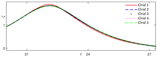 Comparisons of the surface elevation time series of the five grids at the top of the ramp are shown in Figure 2, where is the free surface elevation. The results of Grids 2, 3, 4, and 5 are in good agreement. Here, Grid 3 was chosen for the solitary wave study.