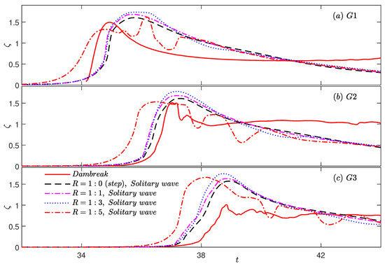 Comparisons of surface elevations recorded by the three gauges, G1, G2, and G3, at , respectively, for an solitary wave propagation over a submerged ramp with various slopes, and the bore generated by equivalent dam-break case with .