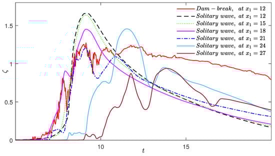 Figure 5 shows that the solitary-wave surface elevation at gives the closest agreement with the dam-break surface elevation before , whereas the solitary-wave surface elevation at is higher than dam-break before . It is concluded that the solitary wave at is more suitable for comparison with the dam-break bore.