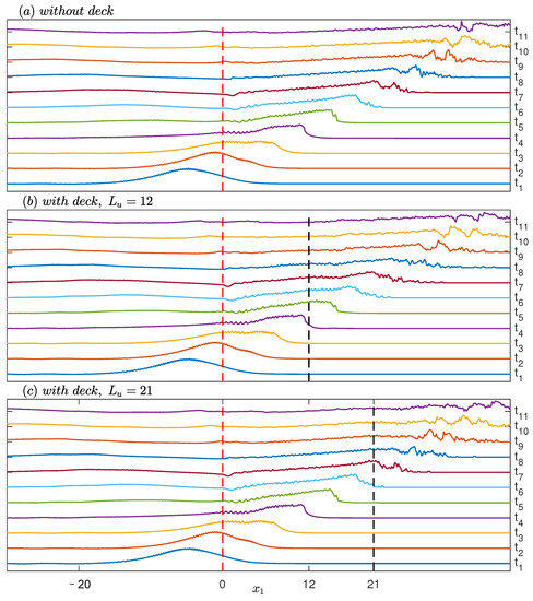 Snapshots of the solitary wave propagating over a submerged step, (a) without a deck, or with a downwave deck whose leading edge is at (b) , or (c) , are shown in Figure 6. The two dashed lines show the position of the leading edge of the deck at in Figure 6b and at in Figure 6c, respectively.