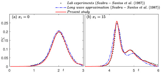Seabra-Santos et al. [53] carried out experiments to study the propagation of solitary waves over a downwave step in the long channel of the Institut de Mécanique de Grenoble. The channel is 36 m long, m wide, and m deep. In the case considered here, , , and 1:0.