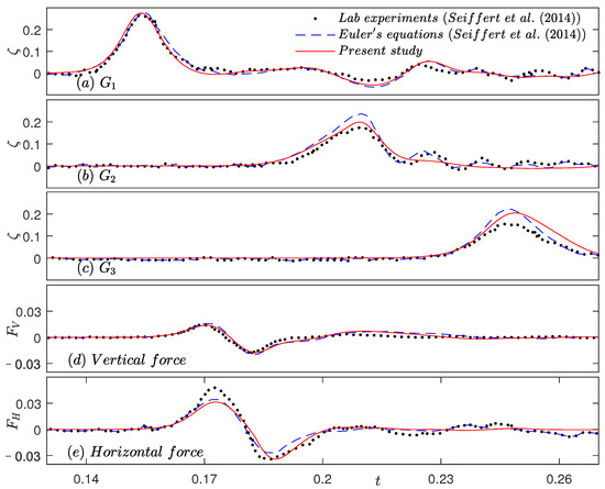 Solitary wave propagating over a submerged deck, (a–c) surface elevation recorded at gauges , , and , respectively, (d) vertical force, and (e) horizontal force. Results of the present study are compared with laboratory experiments and computations of [20], .