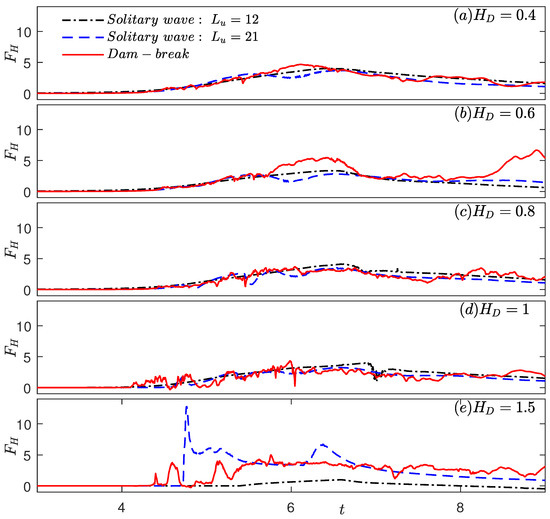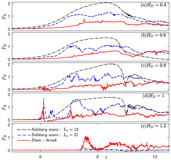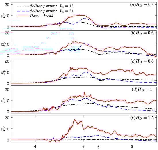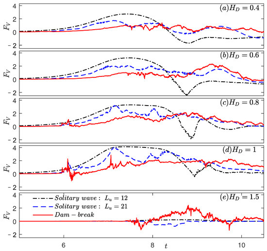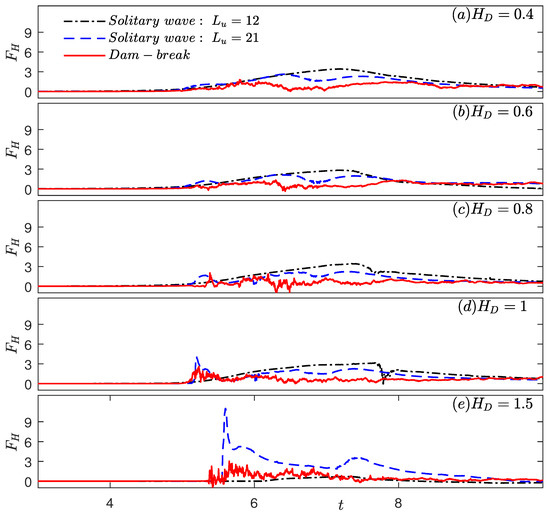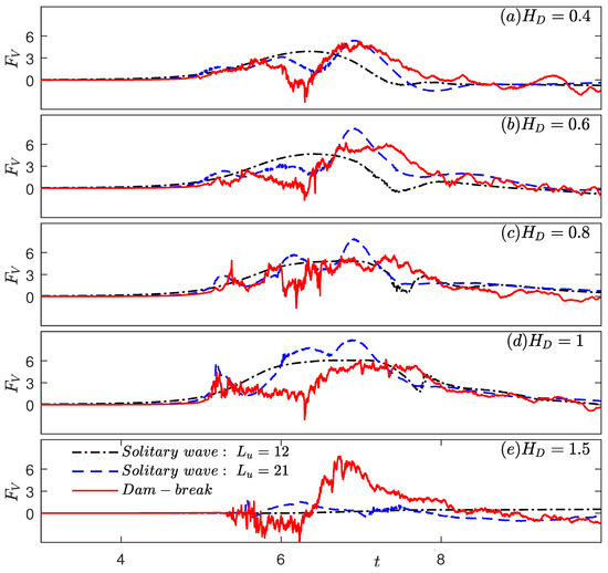The time series of solitary wave horizontal and vertical forces on the deck is shown in Figure 13 and Figure 14, along with the dam-break horizontal and vertical forces for , respectively. The peak values of the forces are listed in Table 8.
