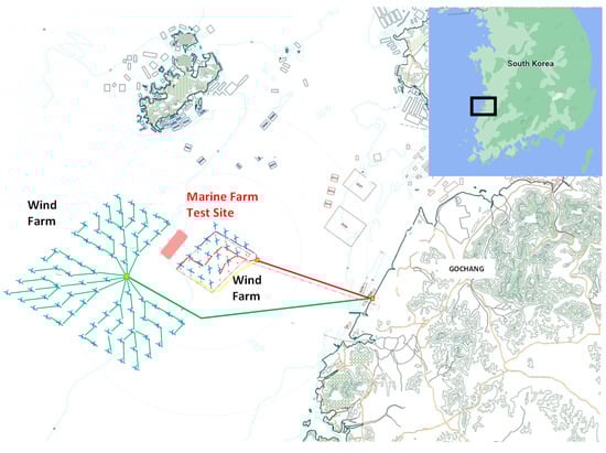 An offshore aquaculture farm in Korea will, according to plans, be installed in a fixed offshore wind farm to demonstrate the co-existence, as depicted in Figure 1. The sub-surface longline marine farm is 10 km off the south-west shore of Korea. Before the commercial scale farm installation, a pilot size farm with 200 m × 200 m will be considered. This size farm has been widely used in Korea in coastal and sheltered areas. However, the offshore farm is situated in the open ocean, having much harsher environments than the sheltered farms.