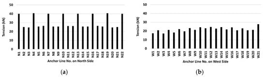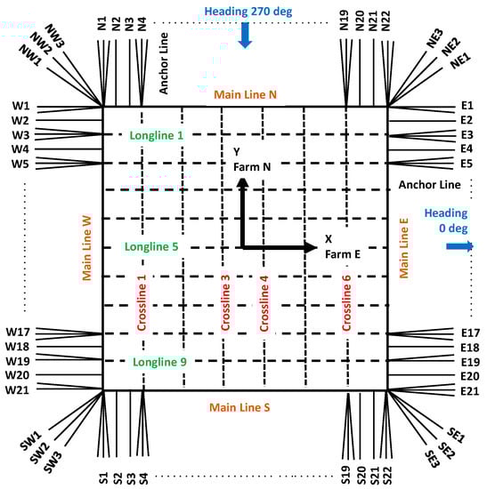 To identify the farm lines, the main lines, longlines, crosslines, and anchor lines are notated and numbered in Figure 2. The anchor lines are configured with a straight line and angled lines. The angled anchor lines in the grouped lines are tied to the straight-line end on the main lines. For example, N1, N1W, and N1E are tied to the same location on the main line. Here, N1W and N1E indicate the west and east (angled) side lines to the N1 (straight) line. The angled line notations are omitted for clarity. Other line notations are omitted for reasons of self-explanation. The crosslines are tightly connected to the longlines at the crossing points. As shown, a high number of the anchor lines are distributed alongside the farm boundary. This can contribute to reducing the anchor line tensions, resulting in an anchor load level such that, first, a small size anchor readily available domestically in Korea can be utilized and, second, the anchor failure effect to the farm during a typhoon or storm may be minimized.