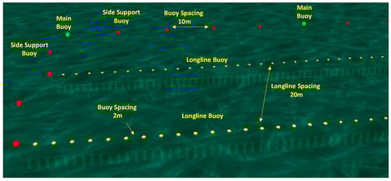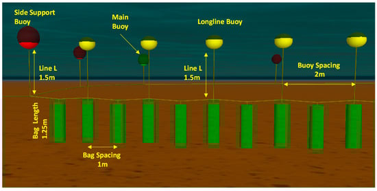 A part of the farm is shown in Figure 3 and Figure 4, where the main buoys, side support buoys, longline buoys, oyster bags, associated line lengths, and spacings are presented. Main buoys (green) are distributed 50 to 60 m apart on the main lines while the side support buoys (red) are distributed every 10 m spacing. The longline buoys (yellow) are distributed every 2 m along the longlines. The spacing between the 1.25 m long oyster bags is 1 m. The marine farm is designed to be submerged at 1.5 m so that length of each buoy line used is 1.5 m.