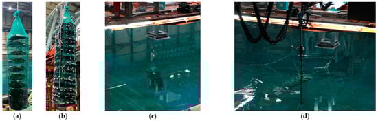 The series of tests was conducted at the Ocean Wave Basin in KRISO [37], using a full-scale single oyster bag to determine the drag coefficients of the bag. The tests under various current and wave conditions were repeated for both non-marine growth and marine growth bags in Figure 5a,b. However, the marine growth results were selected for the present numerical analysis. Two different oyster bag configurations were considered: a fixed bag and a free hanging bag. The properties of the bag line used for the model test are provided in Table 4. The line ends of the submerged fixed bag were fixed while the bottom end of the free-hanging bag was set free. The bag was towed at various current (tow) speeds and the forces were measured. The tow tests that were captured are presented in Figure 5c,d. Line tensions and the angle of inclination of the bag were measured for the free hanging bag tests. Tensions on the free hanging bag were also measured for the regular waves without towing.