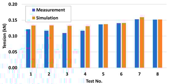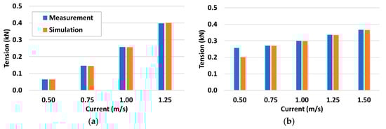 The measured and simulated tensions are compared in Figure 6, where the simulated values are based on the correlated coefficients in normal and axial (tangential) directions. Differences between measurements and numerical results are within 1%, except the free-hanging case for a current 0.5 m/s, which presents about 20%. The normal drag coefficient is estimated to be 1.0 for the tested currents, whereas the axial drags coefficients decrease quickly as the current speed becomes higher. The measured normal drag coefficients of 1.0 is close to a value of 1.05 for a high Reynolds number Rn (Rn > 106) and a large Keulegan-Carpenter number Kc with high roughness on a circular cylinder [33]. The Rn number and Kc number for the tested cases are summarized in Table 7.