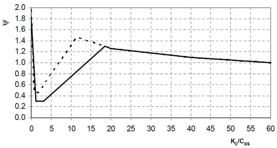 where Keulegan-Carpenter number is , H is the wave height, and D is the characteristic diameter. is the drag coefficient dependent on roughness of and the wake amplification factor . Figure 7 indicates the variation of the wake factor as the function of Kc/CDS for a circular cylinder [33]. The wake amplification factor can be applied to non-circular cylinders.