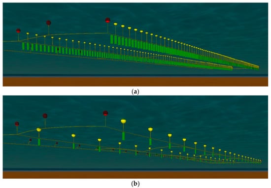 Farm model comparison: (a) complete model and (b) lumped model, showing the oyster bags (green), longline buoys (yellow) along with main lines and the side support buoys (red). For clarity, mooring lines are omitted.
