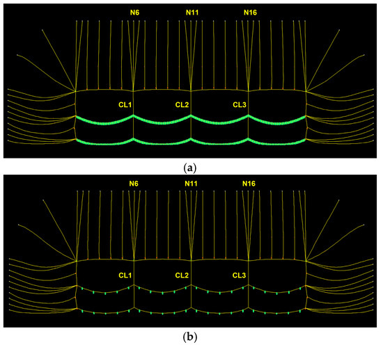 A partial marine farm with two longlines was considered. The number of the mooring lines and cross lines were reduced for the validation simulation, and the mooring lines and cross lines are, thus, re-notated as shown in Figure 10. Figure 10 also shows the line displacements captured at a time instant of dynamic simulation for the MSL case in Table 7.