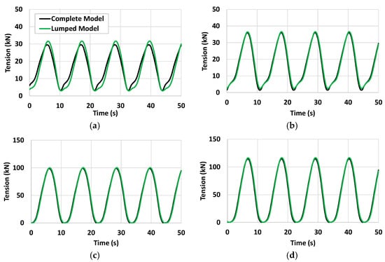 Tension time histories from the complete and lumped model simulations of the partial farm in regular wave: (a) anchor line N11 tension in MSL; (b) anchor line N11 tension in HSWL; (c) crossline CL2 tension in MSL; (d) crossline CL2 tension in HSWL. Regular wave and current are from the farm north (270 deg).