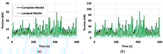 With the same drag coefficient setting, the irregular waves were tested with the complete and the lumped models. The tension time histories for the 10 min simulation are compared in Figure 12 for the anchor line N11 and the cross line CL2. The crossline tensions are at the 0 m from the north end of the line. The statistics of the tensions of the mean, standard deviation (STD) and peak are summarized in Table 8. It can be observed that the lumped model results once again agree well with the complete model values.