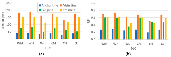 The farm system load may be decomposed into loads induced by the wave and current. For this, simulations are repeated with current-only and wave-only cases. The results are compared in Table 9. Here, “current + wave” indicates a linear superimposed value of wave and current results, while “Current wave combined” are the results from the wave-current coupled analysis by combining them together, as described in this section. Four of the farm components of anchor line N10, crossline 3, main line west, and longline 5 are selected. The location details are specified Table 9. It can be seen that the wave loads are dominant over the current loads, which suggests that the longline farm design for an offshore installation primarily considers the effects of the wave. The linear superimposed values can be observed to be smaller than the results from the wave-current combined (coupled) case. The difference may be due to nonlinear coupling between the farm components, the wave, and the current under the extreme seas. It can be suggested that the analysis of the offshore longline farm considers both the wave and current together.