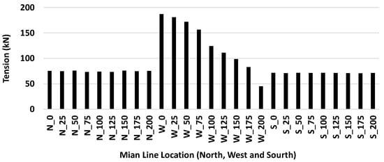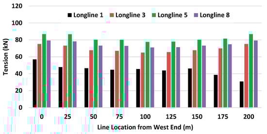 Four longlines of line 1, 3, 5, and 8 among a total of 9 lines are selected, and their tensions are compared in Figure 17. Longline 1 is the first line in the upstream, and others are in the downstream directions. Locations across each longline indicate the distance from the west end toward the east end. It is seen that longline 5 experiences the largest tension among the others. Longline 5 is located at the middle of the farm, which is about 80% of the incident wavelength. This indicates that the longlines with the oyster bags near the middle of the farm may have more coupled motions by the incident waves considered (Table 3). It can also be observed that the tensions at both ends of the lines (0 m and 200 m) are greater than other locations across each line. This is due to a partial load transfer from the inside to outward locations of the longlines.