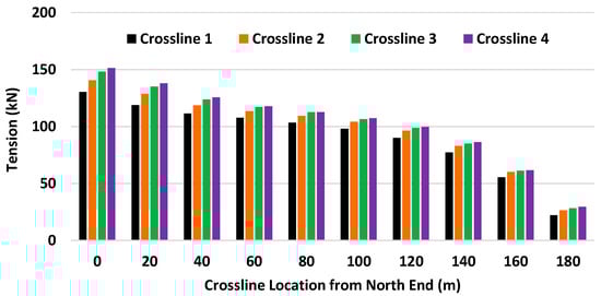 Figure 18 compares the crossline tensions of line 1 to 4. Here, the locations on each line are distances from the north end. The tensions on each line gradually decrease down the line to the south. Similar results are observed in the main line tensions on the west side (Figure 16). The crosslines of lines 3 and 4 in the middle of the farm width present higher tensions than other lines.