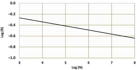 where N is number of cycles, and R is the ratio of the tension range to minimum breaking strength. Figure 19 presents the fatigue design T-N curve of a fiber rope, where the slope M and intercept K values are 13.46 and 0.259, respectively.