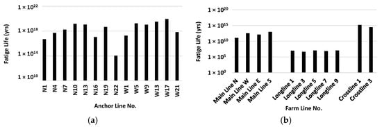 Minimum fatigue life of farm lines: (a) north and west anchor lines (b) main lines, longlines, and crosslines.