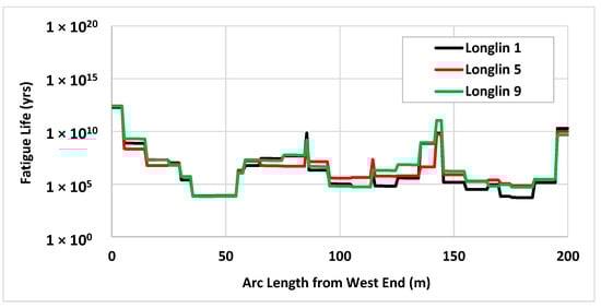 Fatigue life distribution of longlines along the arc length from the west end to the east end points.