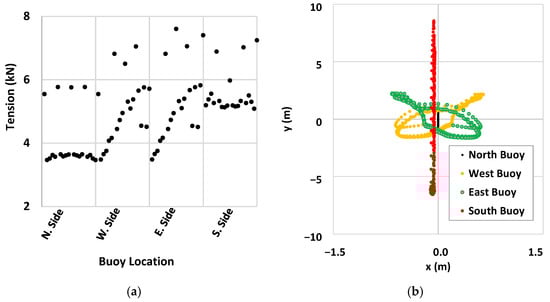 There are a total of 80 buoys (main and side support buoys) installed along the farm boundary of the north, west, east, and south sides. The tensions of those buoy lines connecting the buoys and the main lines are compared in Figure 23a. Tensions are in the range of about 3.5 to 7.6 kN, which is smaller than the MBLs in Table 4. Among the scattered tension points, the upper points on the same side (e.g., N. side) indicate the tensions from the main buoys, while the lower points are from the side support buoys. This may be due to the larger size of the main buoy than the side support buoy. Four main buoys located at the middle of each side of the farm are selected and their horizontal motion trajectories from the mean position are plotted in Figure 23b. The main buoys in the east and west sides move around the mean position with an almost symmetrical pattern with each other. However, the main buoy in the south side experiences much higher motion compared to the upstream buoy (north side), which may be associated with higher displacements of the downstream longlines and main lines that are under less tension compared to the upstream lines.