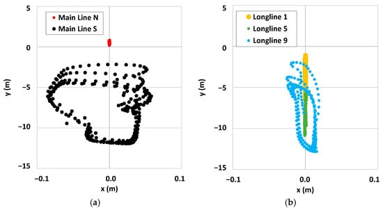 Main line and longline displacement trajectories at the middle of each line length for DLC-WH (ULS): (a) main line north and south; (b) longline 1, 5, and 9.