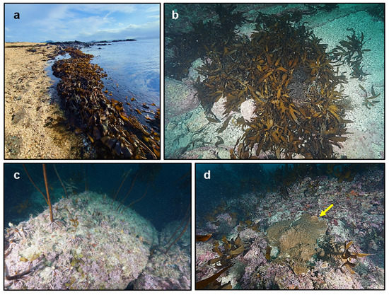Photographs of typhoon impacts at Seongsan, Jeju Island, Korea. (a) Ecklonia cava deposited on the coastal intertidal zone at Rhodolith Beach on Udo Island near Seongsan. (b) E. cava detached from the benthic substrate. (c) E. cava holdfasts with the stipe and/or blade removed at 10 m depth. (d) A colony of scleractinian coral Montipora millepora (yellow arrow) revealed after the typhoon at 15 m depth.
