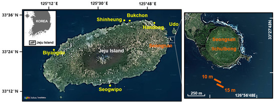 Jeju Island is a volcanic island located approximately 100 km off the southwestern coast of the Korean peninsula. The study was conducted at Seongsan in the east of Jeju Island (Figure 2). The Seongsan coastline is characterized by a rocky shore composed of basaltic bedrock, boulders, and sandy patches. Seongsan marine environment is heavily influenced by the Tsushima warm current and strong tidal currents [32]. Moreover, it exhibits significant seasonality, with seawater temperature fluctuating between 12.8 ± 0.9 °C in winter and 23.4 ± 1.5 °C in summer over the last decade (average of seawater temperature from January to March and from July to September, respectively, from 2013 to 2022; Korea Hydrographic and Oceanographic Agency; http://www.khoa.go.kr, accessed on 31 March 2023).