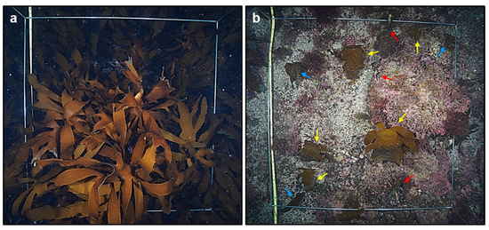 1 m2 photo-quadrats from the 100-m line transects captured with an underwater camera at maximum resolution (7952 × 5304 pixels). (a) A photo-quadrat from May before the typhoon showing a dominance of adult E. cava at 10 m depth. (b) A photo-quadrat from November after the typhoon showing recruits (blue arrows), adults (yellow arrows), and holdfasts (red arrows) of E. cava at 15 m depth.