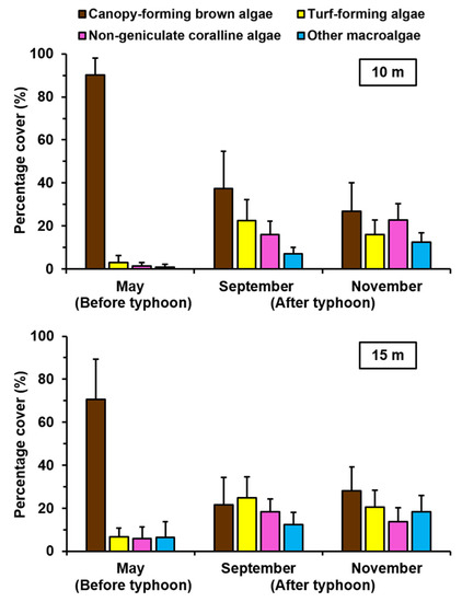 Twenty-one benthic taxa were identified (Table 1). Overall, the mean percentage cover of canopy-forming brown algae (E. cava, Sargassum spp.) decreased rapidly at 10 m and 15 m depth after the typhoon (Figure 4). Before the typhoon, canopy-forming brown algae percentage cover accounted for 90.1% at 10 m depth, and 70.6% at 15 m depth. The percentage cover of canopy-forming brown algae was consistently higher at 10 m depth than at 15 m depth, except for the value from November. In contrast, the percentage cover of turf-forming algae and other macroalgae taxa was generally lower at 10 m depth than at 15 m depth. The percentage cover of non-geniculate coralline algae was generally higher at 15 m depth than at 10 m depth, before and after the typhoon except in November. The percentage cover of other sessile organisms before the typhoon was extremely low due to the dense canopy blocking everything growing underneath from sight.
