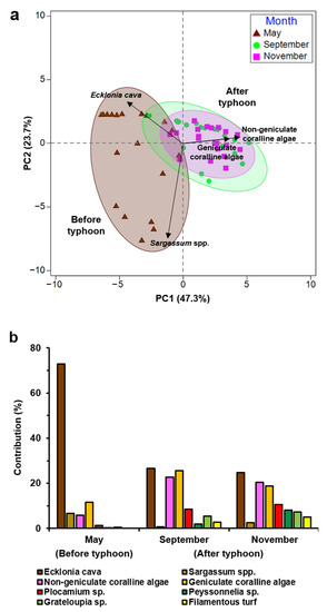 (a) Principal component analysis (PCA) biplot of the square-root transformed data, showing the relative contributions of major benthic species to the different communities at Seongsan at different months. Each point represents a replicate (i.e., photo-quadrat) and each arrow represents a species. (b) The contributions of major benthic species within months by SIMPER analysis of similarities.