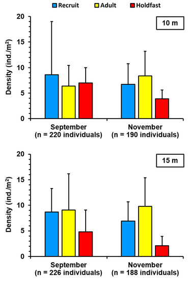 The density (ind./m2) of different morphological forms (recruit, adult, and holdfast) of E. cava observed at depths of 10 m and 15 m at Seongsan in Jeju Island after the typhoon. The whiskers of the bar graph represent the standard deviation.