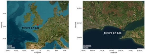 Milford-on-Sea is located at the eastern side of Christchurch Bay in Hampshire, UK, as shown in Figure 1. The area is of particular interest due to its unique coastal elements, including a cliff eroding at the western side near Barton on Sea, a natural beach at Hordle Cliff, and coastal defense structures comprising timber groins and a seawall between Milford-on-Sea and Hurst Spit. The field site is subject to predominant SSW wave direction and semi-diurnal tides with a spring tidal range of 2 m.