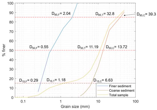 The area is characterized by a beach composed of finer (sand) and coarser (cobbles, gravel) sediment grains. The median grain size of the total sample composing the mixed beach, D50, is equal to 11.19 mm. The relationship between D85 and D15 is 27.79 (where D85 and D15 represent the particle diameter for which 85% and 15%, respectively, of the material is finer). Figure 2 shows the percentage of material passing through the sieve for three different samples: fine, coarse, and the total sample. Three dashed red lines are also included in the graph to indicate the percentage of material passing through specific sieve sizes. The figure also displays the values of D15, D50, and D85 for each sample, where the subscripts F, C, and T correspond to the finer, coarse, and total sample, respectively.