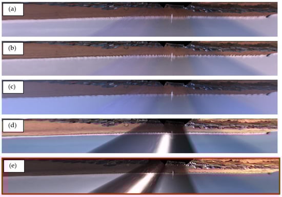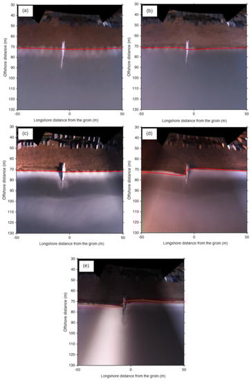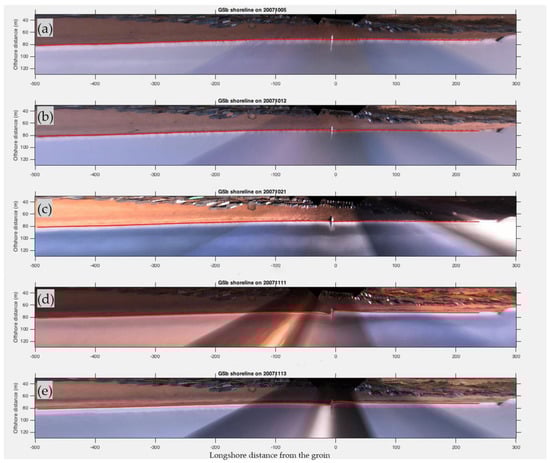 Figure 4a–e show the first 5 available ARGUS images during the field experiment period. The figures correspond to the following dates and times: (a) 1 October 2007 at 16:50, (b) 2 October 2007 at 09:30, (c) 3 October 2007 at 06:30, (d) 4 October 2007 at 13:50, and (e) 5 October 2007 at 15:50. The shoreline is not always well defined due to visible foam in breaking waves at the water–beach interface. ARGUS images are selected during a calm sea state to ensure accurate identification of the shoreline. For example, the first selected image among the first 5 available is the image taken on 5 October 2007 at 15:50 (Figure 4e), representing the first image where the shoreline is clearly detectable.