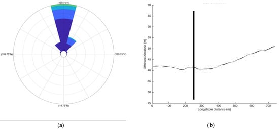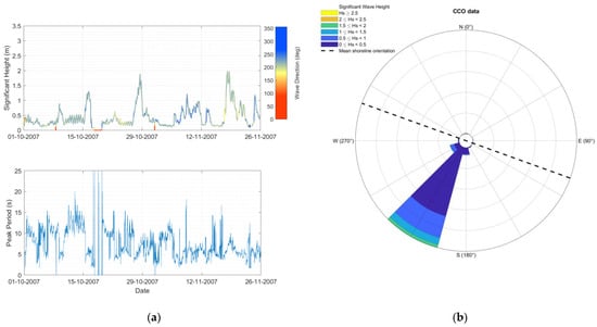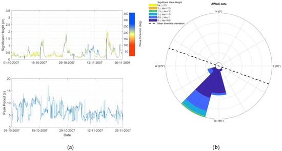 The Nortek Acoustic Wave and Current (AWAC) profiler was used to collect significant wave height, peak period, and mean wave direction with hourly time step during the period from 1 October 2007 to 25 November 2007 (Figure 5). The AWAC profiler was located at a water depth of 7 m, approximately 600 m offshore. The wave direction is referred to with respect to the geographic north. The line color of the significant wave height (up panel of Figure 5a) depends on the wave direction. The green color corresponds to waves from orthogonal direction to the mean shoreline orientation (no longshore transport). The blue color indicates waves coming from an angular sector producing a negative longshore transport (waves from SSW), whereas yellow/red colors represent waves coming from the angular sector producing a positive longshore transport (waves from SSE). In the wave rose (Figure 5b), the mean shoreline orientation is indicated by a dashed black line.