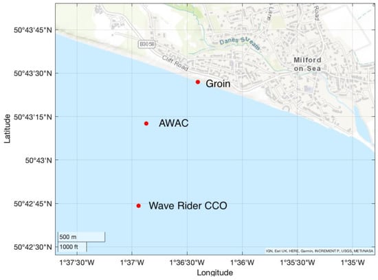 The third-generation wave model, SWAN, developed by the Delft University of Technology [31], was used to propagate the wave data collected by the Directional Waverider Buoy from its location, approximately 1500 m offshore at a water depth of 10 m (50.71229 N, −1.61568 E), to the AWAC location, approximately 600 m offshore at a water depth of 7 m (50.72015 N; −1.61450 E) (Figure 7).