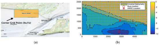 The bathymetry data of Milford-on-Sea were obtained from the EMODNET portal (http://portal.emodnet-bathymetry.eu/ accessed on 17 January 2019) in ESRI ASCII format. Figure 8 shows the “Area of interest” and the corner grid point coordinates X0, Y0 (−1.655 E, 50.710 N).
