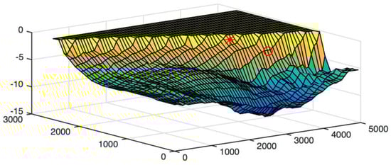 The bathymetry data in the selected area are a matrix consisting of 23 rows and 68 columns, with a grid spacing of 73.577 m in the x-direction and 115.878 m in the y-direction. The bathymetry data grid length in the x-direction is 4929.664 m, and in the y-direction it is 2598.318 m. Table 1 provides a summary of the data grid information.
