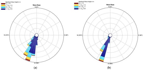Wave rose of (a) AWAC data and (b) SWAN data obtained after wave propagation from the buoy location (1500 m offshore, 10 m water depth) to the AWAC location (600 m offshore, 7 m water depth).