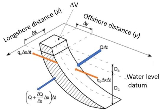 The explicit finite difference scheme solves the relationship between the longshore transport rate and shoreline accretion/erosion, which is caused by spatial and temporal variations in longshore transport. This relationship is formulated by the sediment continuity equation in a control volume, ΔV (Figure 12):