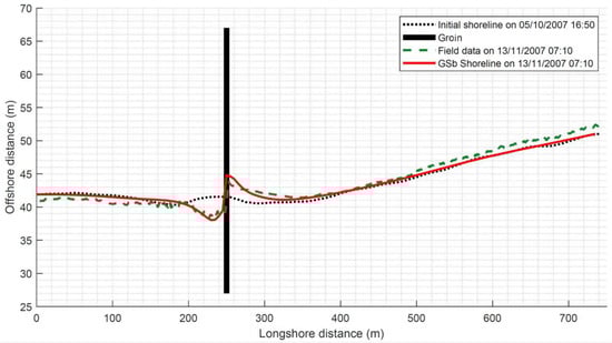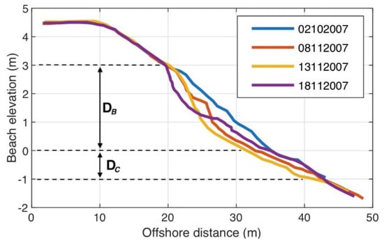 The first selected ARGUS shoreline available after the groin deployment (5 October 2007) was assumed as the initial shoreline. The values of closure depth and berm height, Dc and Db, respectively, were selected equal to 1 m and 3 m, respectively, based on an accurate evaluation of the cross-shore beach profile evolution over time (Figure 13) [18]. The nominal diameter of the sediment equal to Dn50 = 11.19 mm was assumed. The computational domain was assumed to be 740 m long with a grid size of DX = 5 m and NX = 148. The groin was positioned at the coordinate = 250 m. The time step for the simulation was set to 0.05 h (180 s), and the total duration of simulation was 39 days. Following [44], fixed boundary conditions were used since they are far away from the groin (i.e., the length of the entire calculation domain is on the order of two or three groin length). It assures that the boundary conditions are unaffected by changes that take place in the vicinity of the groin.